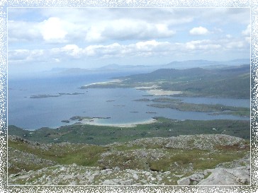 Die Aussicht geht von hier aus nach Norden zu den breiten Sandstränden bei Louisburgh und Clare Island, im Osten baut sich das gewaltige Mweelrea Massiv auf, südlich ist die Bergkette der Twelve Bens zu sehen und im Westen reicht der Blick über den Tully Mountain hinaus bis zur Insel Inishbofin.