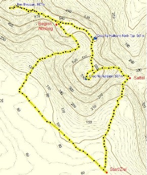 Wir steigen in nordwestlicher Richtung weiter an und schwenken nach ca. 400m (Höhe ebenfalls ca. 400m) scharf nach Westen. Wenn wir nun zurück schauen können wir etwas oberhalb des Sattels über den wir aufgestiegen sind den Bergsee „Lough Mám Ochóige“ erkennen. Nachdem wir weitere 100 Höhenmeter erklettert haben beginnt rechts von uns der Pfad, der über den Kamm zum Binn Bhriocáin führt. Wir steigen jedoch weiter nach Westen auf und erreichen bald den Gipfel des Cnoc na hUilleann.