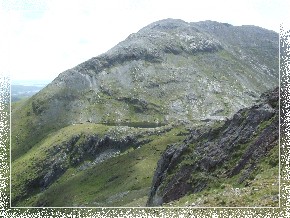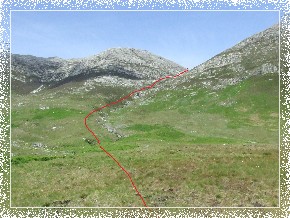 Von der kleinen Brücke aus folgen wir dem Bachlauf durch wegloses Gelände auf den Sattel zu, der den Binn idir an Dá Log mit dem Cnoc na hUilleann verbindet und den Namen „Mám Ochóige“ trägt. Ein steiler Grashang zieht sich vor uns hinauf auf den Sattel. Links wird der Hang durch einige Kalksteinfelsen begrenzt, rechts ragen die schroffen Quarzitwände des Binn idir an Dá Log auf. Wir suchen uns auf dem Grashang den einfachsten Weg nach oben und haben auf dem Sattel schon eine Höhe von 350m erreicht.