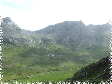 Vom Parkplatz aus folgen wir dem Western Way auf der Straße nach Südwesten. Nach ca. 300 m macht die Teerstraße einen Bogen nach links, wir bleiben aber auf dem Western Way, der durch ein Gatter in die die freie Landschaft führt. Nach ca. 30 Minuten erreichen wir einen Sattel (St. Patricks Bed genannt) und können rechts am Hang eine Pilgerstätte mit Kreuzwegstationen und St. Patricks Statue erkennen. Von hier halten wir uns rechts und steigen entlang dem Weidezaun, den wir zuletzt überstiegen haben und der uns zum Gipfelplateau des Binn Chaonaigh führt. Vorbei an einem kleinen Bergsee erreichen wir den südlichen Steinmann auf dem Gipfel. Im Osten ist Lough Corrib zu sehen, im Westen ragt die Bergkette der 12 Bens hinter dem Lough Inagh auf. In nordwestlicher Richtung und im Norden können wir unseren weiteren Weg nahezu komplett überblicken. Ein felsiger Weg steigt hinab zu dem Sattel vor uns und zieht sich dann hoch bis zum Gipfel des Binn Idir an Da Log, der mit seinen 702 m der höchste Gipfel der Maamturk Mountains ist. Vom Gipfel aus suchen wir uns in nordwestlicher Richtung eine geeignete Abstiegsroute zum Lough Mám Ochóige. Entweder auf den Grat links des Sees zuhalten oder rechts am See vorbei steuern, der direkte Weg zum See ist mit Felsen durchzogen und sehr schwer passierbar.