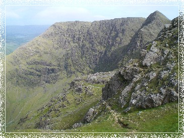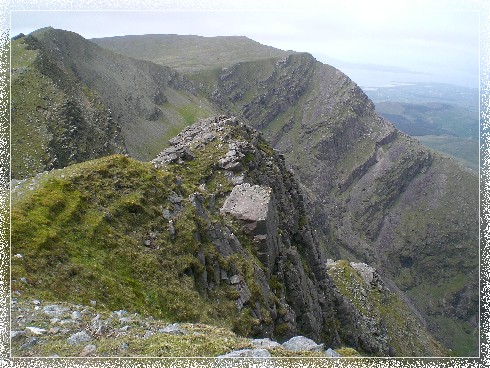 Auf einer Höhe von 400m erreichen wir ein etwas flacheres Stück welches gut für eine erste Rast geeignet ist. Hier reicht der Blick bereits über das Tal von Delphi bis zum Killary Harbour, Irlands einzigem Fjord. Der Hang wird nun für kurze Zeit etwas flacher ehe ein weiterer steiler Anstieg nach Westen zum ersten Gipfel des Ben Lugmore führt. Rechts von uns befindet sich nun die Abbruchkante wo es teilweise bis zu 400m steil hinunter geht. Wir folgen der Abbruchkante weiter nach Westen und erreichen bald den Hauptgipfel des Ben Lugmore mit 803m.