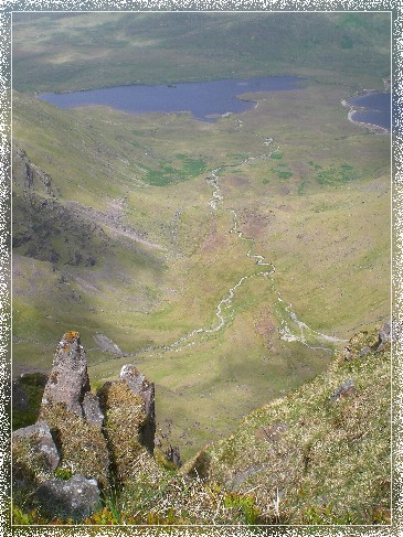 Auf gleicher Route wie wir gekommen sind geht es nun zurück zum Steinmännchen zwischen Ben Bury und Ben Lugmore. Ein Abstecher zum Gipfel des Ben Bury bietet sich von hier aus an, erweitert jedoch die Wanderstrecke um ca. 2 km und ca. 100 Höhenmeter. Vom Steinmänchen aus führt ein schmaler Steig hinunter in das Kar zwischen Ben Lugmore und Ben Bury. Schon nach wenigen Metern kommt eine Engstelle wo es links steil abwärts geht und rechts von uns eine Felswand aufragt. Mit etwas Trittsicherheit passieren wir diese kurze Passage und gelangen nun auf einen angenehmen Bergpfad, der uns ins Tal hinunter bringt. Immer dem Bachlauf in der Mitte des Tales folgend gelangen wir hinunter zum Nordufer des Doo Lough. Von hier aus sind es nur noch wenige Meter bis zur Straße (R355) der wir nach rechts, am See entlang bis zum Ausgangspunkt folgen. Da am Ende einer solchen Wanderung die letzten 3,5 km auf Asphalt keinen Spaß mehr bringen, kann man es mit Hitch Hiking versuchen. Wir hatten Glück und wurden direkt mitgenommen.