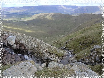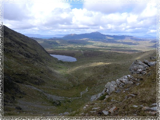 Wir aber drehen nach Nordost und halten auf den kleinen Wasserfall zu der gut sichtbar hier ins Tal hinab stürzt. Wir überqueren den Wasserfall an seinem oberen Ende und gehen weiter Richtung Osten. Unser nächstes Ziel ist der Ostgipfel des Tievnabinnia. Zunächst müssen wir ein wenig absteigen, zu dem Sattel der die beiden Gipfel des Tievnabinnia miteinander verbindet. Nach dem folgenden kurzen Anstieg erreichen wir den Ostgipfel des Berges. Wir sind nun schon etwa 4 Std. unterwegs und werden dafür mit einem sagenhaften Blick nach Norden belohnt der von Clare Island und dem Croagh Patrick dominiert wird.